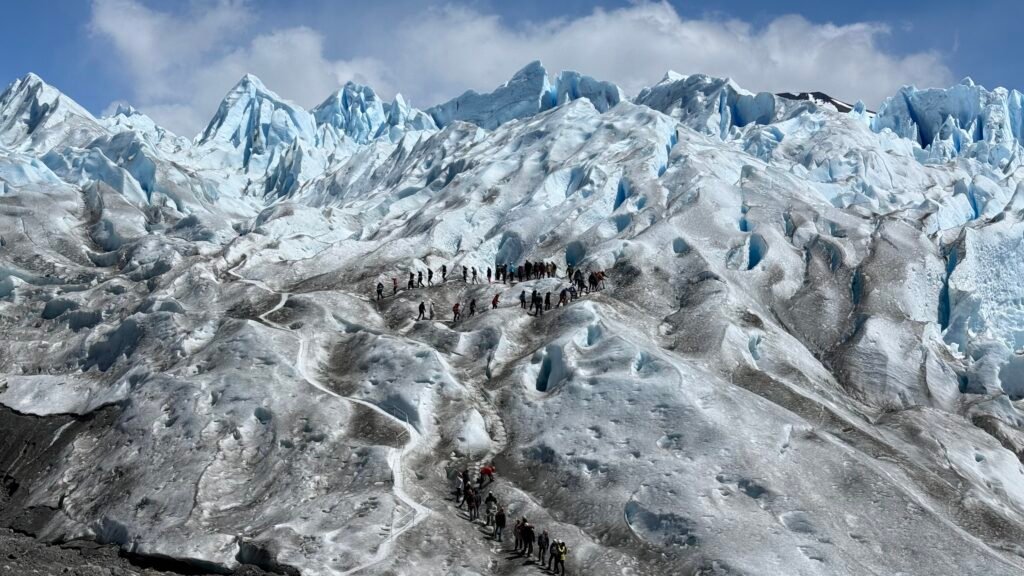 Ponerse los crampones y caminar sobre ese gigante de hielo es algo difícil de describir. Cada paso cruje, el paisaje es completamente blanco y azul, y las formaciones naturales parecen esculturas gigantes creadas por la naturaleza. Es una experiencia que mezcla adrenalina, respeto y asombro absoluto.